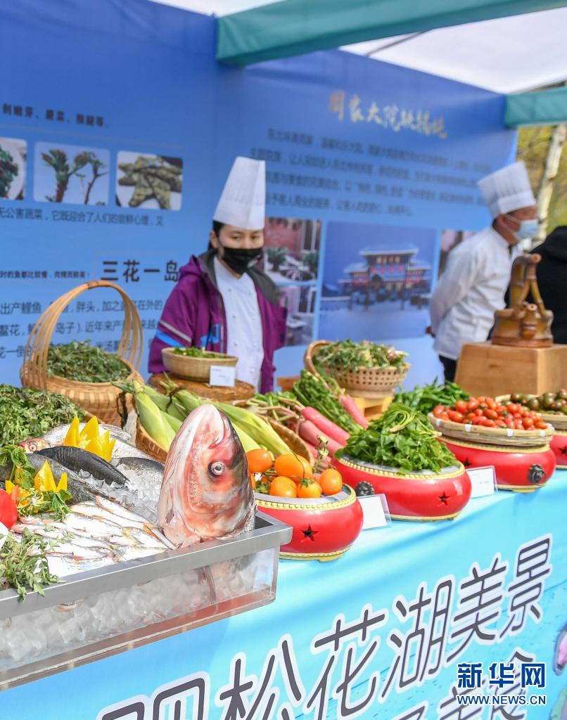 5月1日,在吉林市萬科松花湖度假區(qū)夏季運營啟幕儀式現(xiàn)場,廚師展示開江魚和山野菜等當?shù)靥厣朗场?/p>