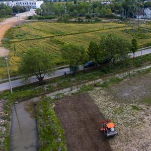在東林鎮(zhèn)保永村,種植戶(hù)操作旋耕機(jī)耕地,準(zhǔn)備播種水稻(5月7日攝,無(wú)人機(jī)照片)。