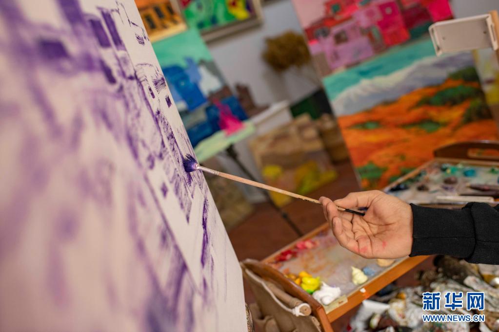 麥麥提吐爾遜江·麥麥提依明在位于新疆喀什古城景區(qū)的工作室內(nèi)進行創(chuàng)作(5月5日攝)。新華社記者 胡虎虎 攝