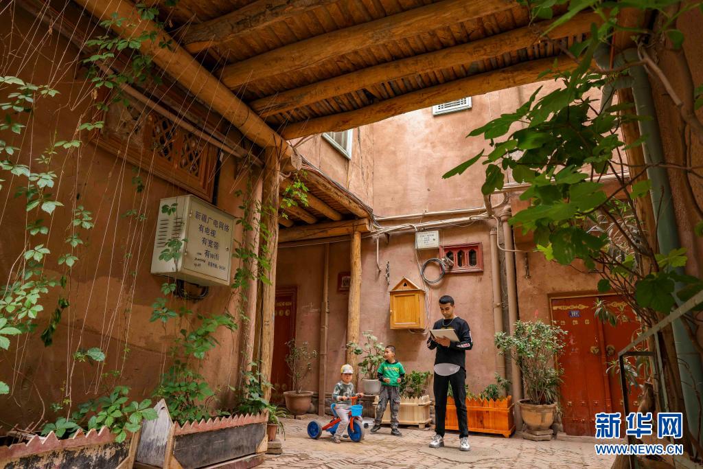 麥麥提吐?tīng)栠d江·麥麥提依明在新疆喀什古城景區(qū)的小巷內(nèi)進(jìn)行速寫創(chuàng)作,兩名小朋友好奇上前圍觀(5月6日攝)。新華社記者 胡虎虎 攝