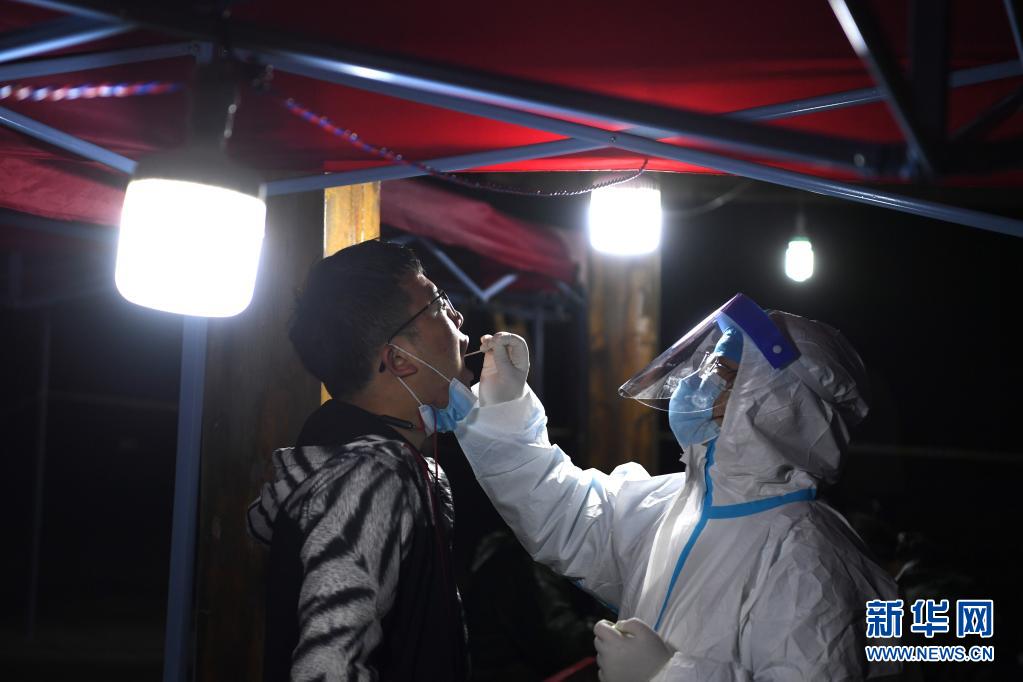 5月16日晚,在肥西縣上派鎮(zhèn)一小區(qū),工作人員為居民進行核酸采樣。