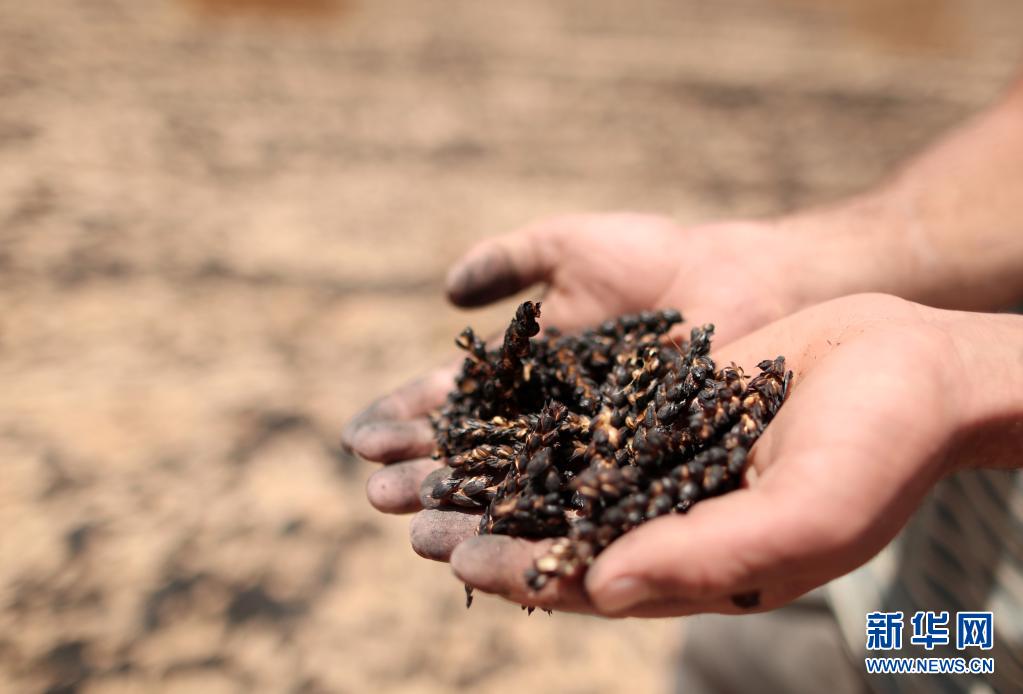 5月22日,在加沙地帶汗尤尼斯,巴勒斯坦農民手捧被以色列炮擊燒焦的麥子。新華社發(fā)(亞西爾攝)