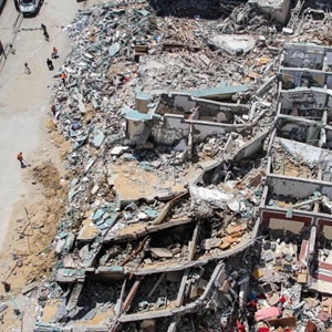 5月23日,巴勒斯坦人在加沙城走過(guò)遭以軍空襲損毀的賈拉塔。5月10日以來(lái),以色列與加沙地帶武裝組織之間爆發(fā)嚴(yán)重沖突。20日晚,哈馬斯與以色列方面各自宣布,雙方已達(dá)成停火協(xié)議,?;饛?1日凌晨開(kāi)始。新華社發(fā)(里澤克·阿卜杜勒·賈瓦德攝)