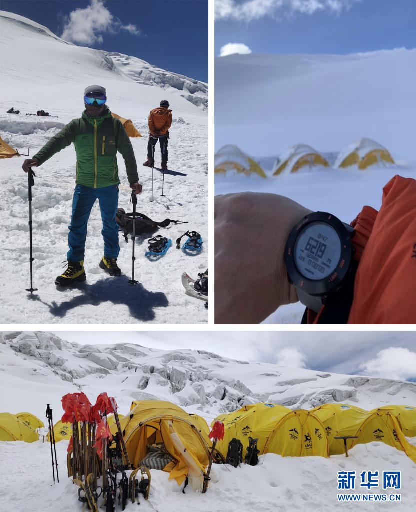 拼版照片:上左為別克米爾扎·圖爾達(dá)力在提供慕士塔格峰登山協(xié)作服務(wù)時(shí),由C1營(yíng)地前往C2營(yíng)地途中(2019年7月24日攝),上右為別克米爾扎到達(dá)慕士塔格峰海拔6200多米的地點(diǎn)(2019年攝);下圖為別克米爾扎拍攝的C1營(yíng)地(2019年6月22日攝)。新華社發(fā)
