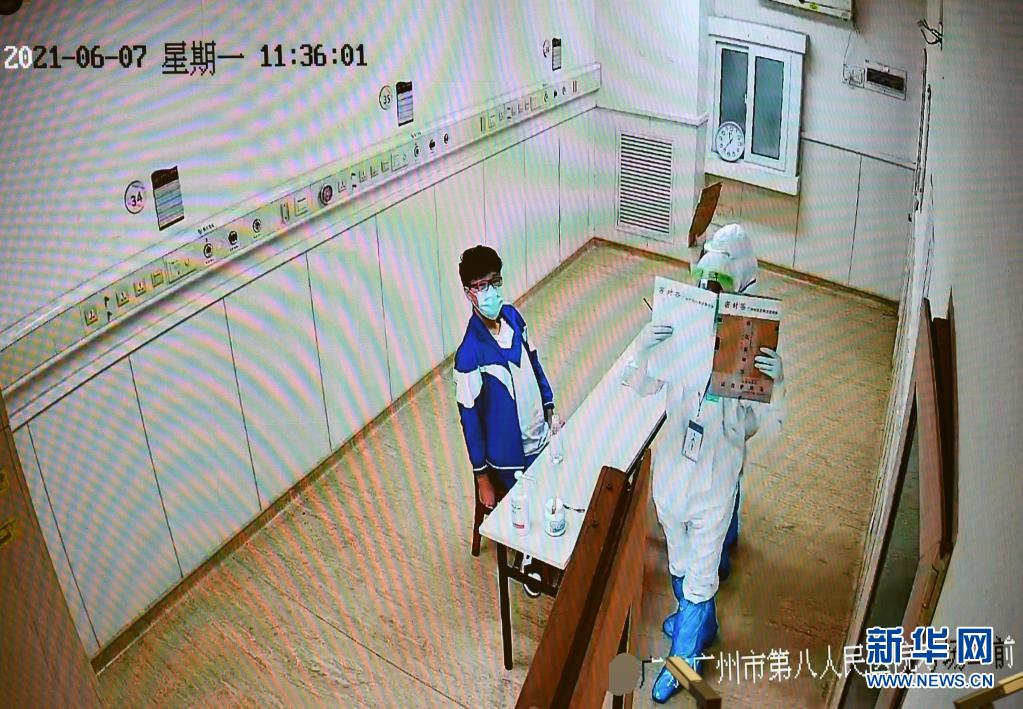 6月7日,廣東省國家教育考試指揮中心的監(jiān)控畫面顯示,上午語文考試結(jié)束后,廣州市八醫(yī)院嘉禾院區(qū)醫(yī)護(hù)人員對(duì)隔離病房考生的試卷、答題卡、稿紙等用品進(jìn)行消毒后裝入試卷袋并向在醫(yī)院清潔區(qū)的視頻監(jiān)考員匯報(bào)。新華社記者 劉大偉 攝