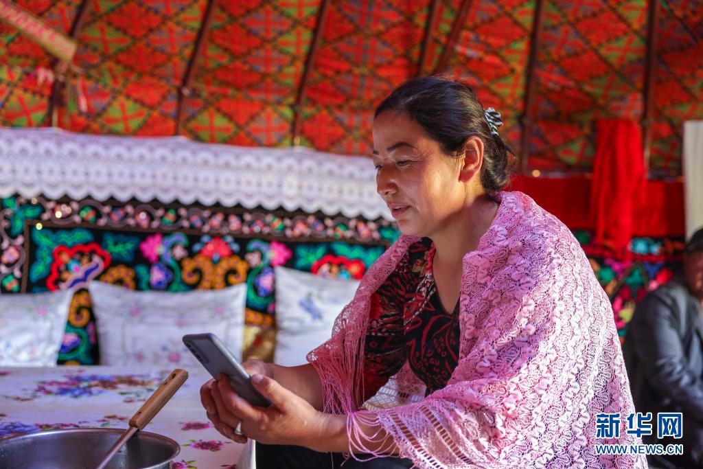 在新疆裕民縣巴爾魯克山區(qū)夏牧場(chǎng)上,一名開辦牧家樂的牧民在氈房?jī)?nèi)用手機(jī)上網(wǎng)(6月16日攝)。