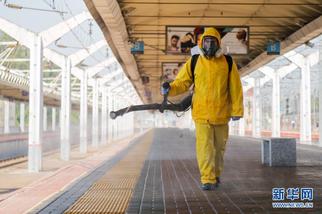 6月24日,工作人員身著防護(hù)服在俄羅斯莫斯科一個火車站進(jìn)行消毒作業(yè)。