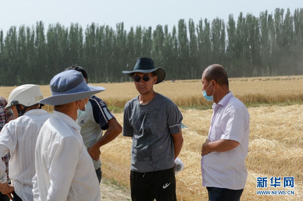 麥客阿地力·沙拉木(右二)在麥田里與麥農閑聊(6月19日攝)。新華社記者 高晗 攝