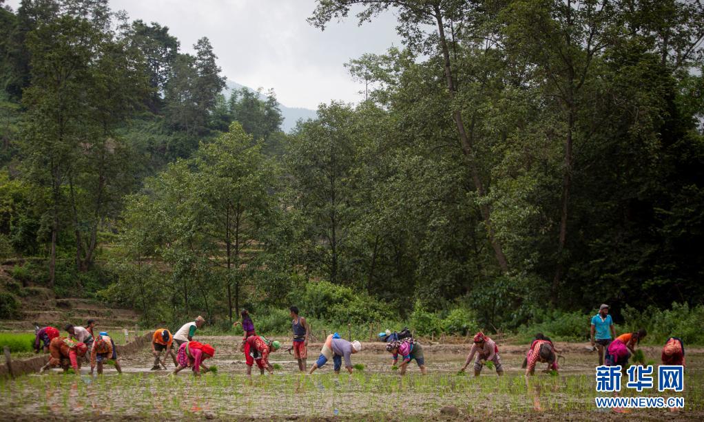 6月29日,農(nóng)民在尼泊爾中部勒利德布爾附近的稻田里插秧。
