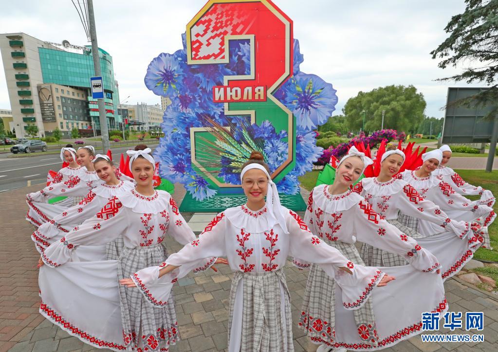 7月3日,演員在白俄羅斯首都明斯克街頭表演舞蹈。