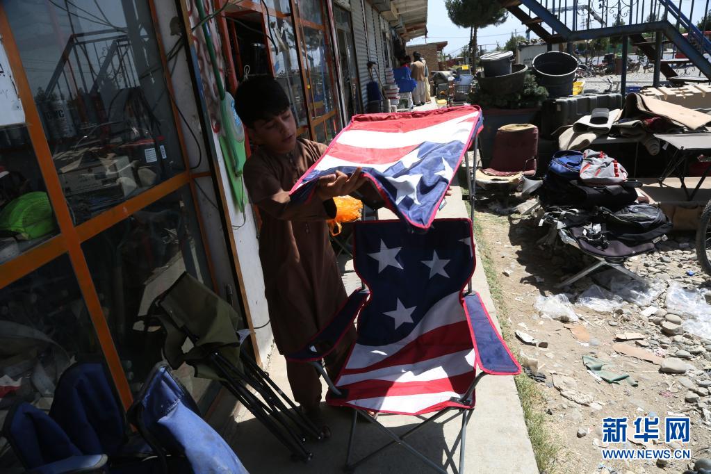 7月3日,在阿富汗帕爾萬省的巴格拉姆空軍基地附近,當?shù)鼐用裨诿儡娺z留下的物品中回收廢舊物。