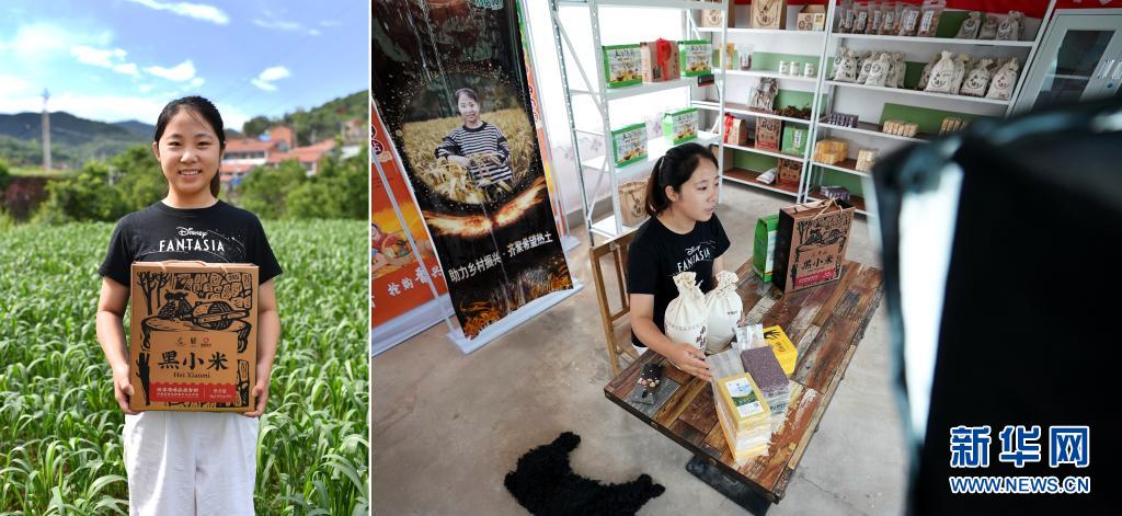 拼版照片:左圖為王亞妮在山西省平順縣南坡村展示包裝好的小米;右圖為王亞妮通過網(wǎng)絡(luò)直播介紹合作社的小米、玉米糝、豆類等農(nóng)產(chǎn)品(7月9日攝)。今年26歲的王亞妮曾是一所學(xué)校的輔導(dǎo)員,2019年回到家鄉(xiāng)創(chuàng)業(yè)。身為農(nóng)民的孩子,王亞妮懂得父輩的辛苦和無奈,勞作一年到收獲季節(jié),農(nóng)產(chǎn)品卻賣不上好價錢。她一直想改變這種現(xiàn)狀,互聯(lián)網(wǎng)讓她看到了希望。通過電商銷售,合作社的農(nóng)產(chǎn)品銷往了全國各地。