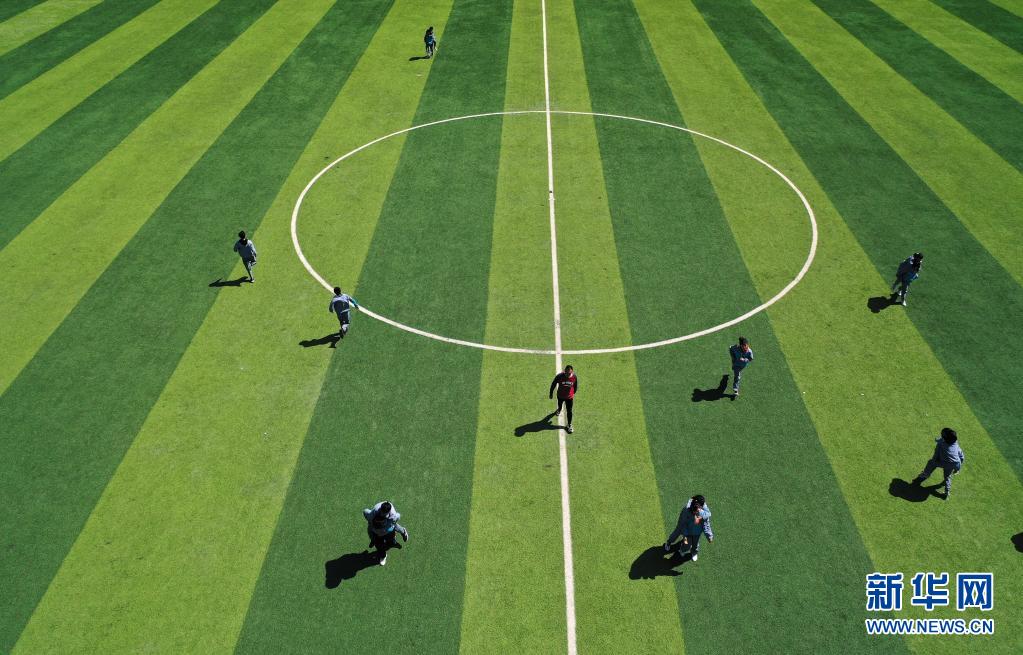 寧夏吳忠市同心縣豫海初級(jí)中學(xué)學(xué)生在上體育課(2020年9月18日攝,無人機(jī)照片)。新華社記者 王鵬 攝