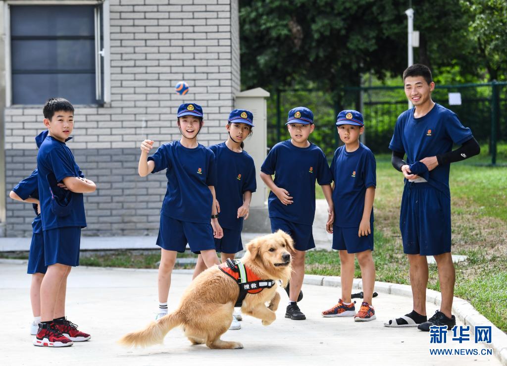 在四川省森林消防總隊(duì)特勤大隊(duì),孩子們和搜救犬“麒麟”互動(7月27日攝)。