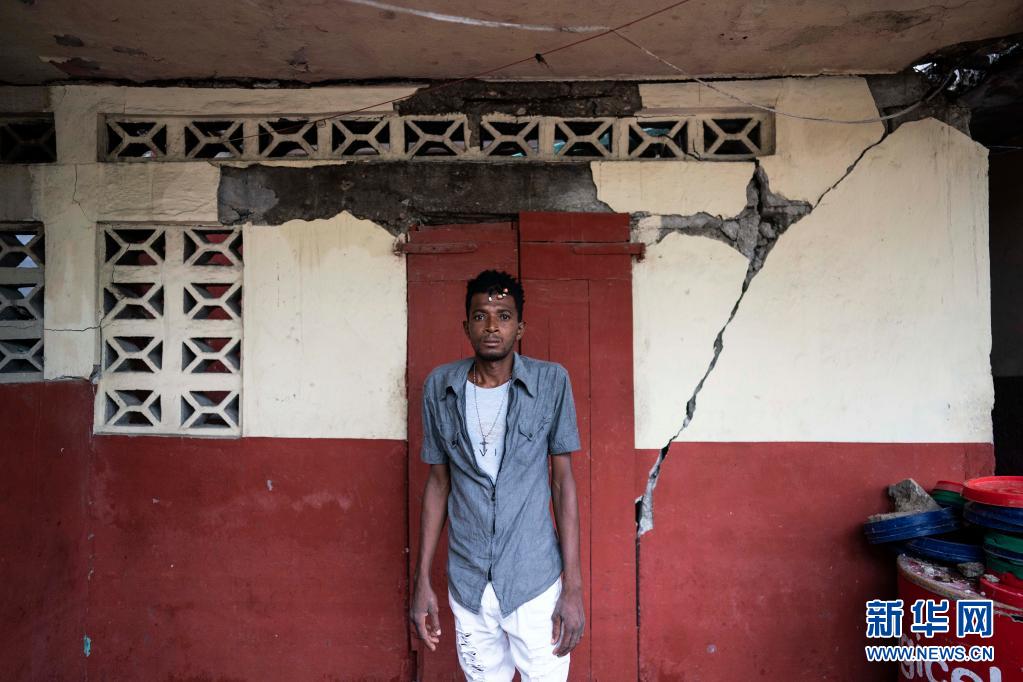 8月17日,海地萊凱一名男子站在自家因地震受損的房屋前。