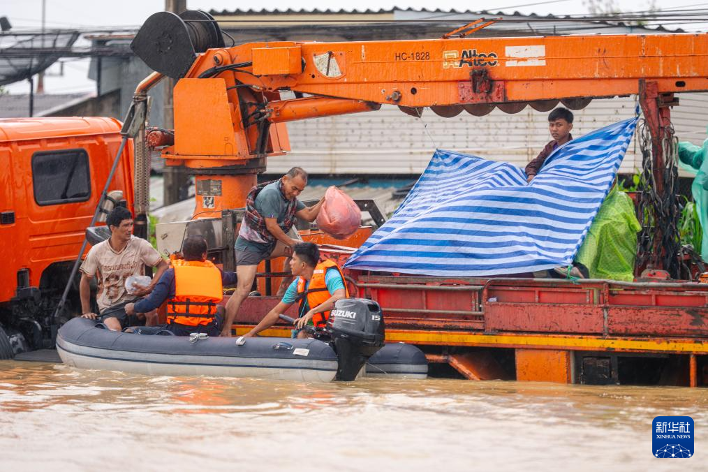 11月25日,在泰国宋卡府合艾市郊,救援人员为受困居民运送物资。