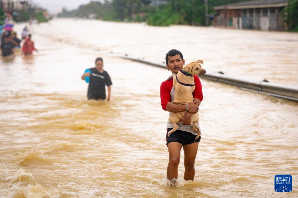 11月25日,在泰国宋卡府合艾市郊,一名男子携宠物狗涉水前行。