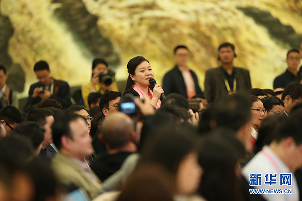 2017年10月17日下午,中國共產(chǎn)黨第十九次全國代表大會新聞發(fā)言人在人民大會堂三樓金色大廳舉行新聞發(fā)布會,并回答中外記者提問。圖為新華社記者提問。新華網(wǎng) 翟子赫 攝
