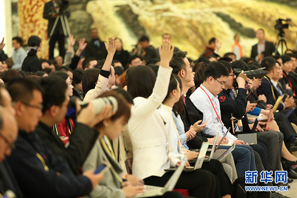 2017年10月17日下午,中國(guó)共產(chǎn)黨第十九次全國(guó)代表大會(huì)新聞發(fā)言人在人民大會(huì)堂三樓金色大廳舉行新聞發(fā)布會(huì),并回答中外記者提問。圖為記者在現(xiàn)場(chǎng)踴躍提問。新華網(wǎng) 翟子赫 攝