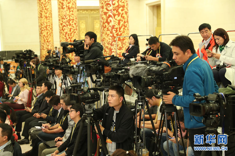 2017年10月17日下午,中國共產(chǎn)黨第十九次全國代表大會新聞發(fā)言人在人民大會堂三樓金色大廳舉行新聞發(fā)布會,并回答中外記者的提問。圖為記者在新聞發(fā)布會現(xiàn)場。新華網(wǎng) 翟子赫 攝