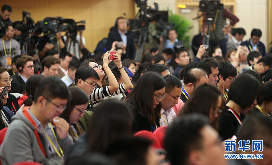 10月23日,十九大新聞中心舉辦記者招待會(huì),邀請(qǐng)中央財(cái)經(jīng)領(lǐng)導(dǎo)小組辦公室副主任楊偉民,環(huán)境保護(hù)部黨組書記、部長李干杰介紹踐行綠色發(fā)展理念,建設(shè)美麗中國有關(guān)情況,并回答記者提問。圖為現(xiàn)場記者。新華網(wǎng) 郝廣鵬攝