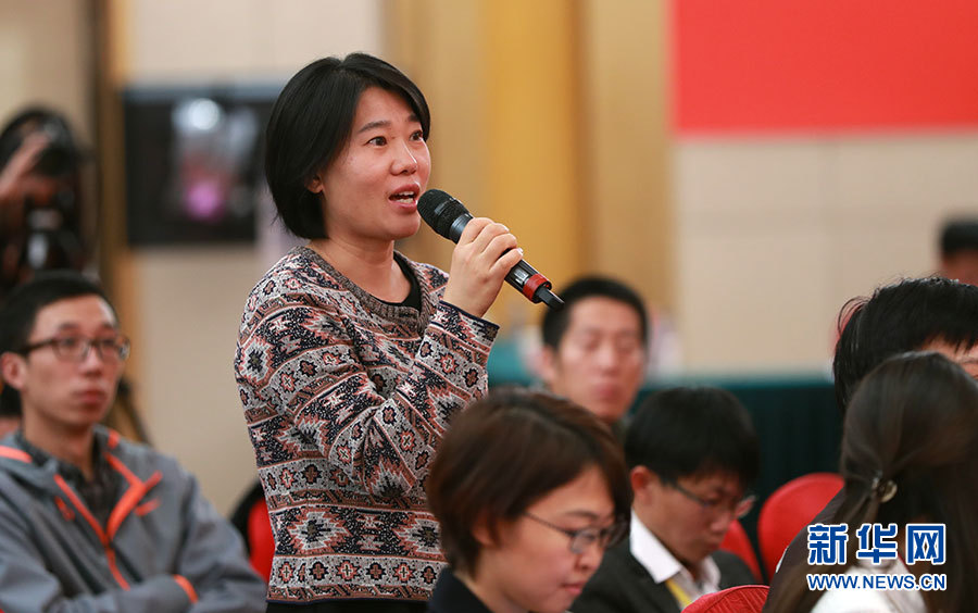 10月23日,十九大新聞中心舉辦集體采訪活動,主題為“打好生態(tài)環(huán)保攻堅戰(zhàn)”。圖為中國海洋報記者提問。新華網(wǎng) 郝廣鵬攝