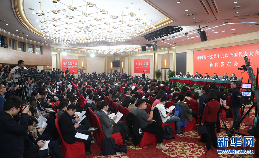 10月26日上午10:00,中國共產(chǎn)黨第十九次全國代表大會(huì)新聞發(fā)言人在梅地亞賓館二層新聞發(fā)布廳召開專題新聞發(fā)布會(huì),請(qǐng)有關(guān)方面負(fù)責(zé)人解讀十九大報(bào)告,并回答記者關(guān)心的問題。圖為新聞發(fā)布會(huì)現(xiàn)場。新華網(wǎng) 王翰林 攝