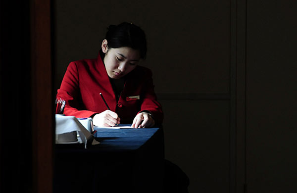 3月2日,京西賓館的服務員用絹花拼出國旗和“喜迎人大”的圖案。當日,為了迎接全國人大代表入住,京西賓館的服務員自發(fā)設(shè)計,并從市場上采購來絹花,在餐廳拼出組合圖案,表達“喜迎人大”的心情。