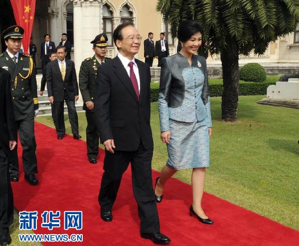 11月21日,中國國務院總理溫家寶在曼谷出席泰國總理英拉舉行的歡迎儀式。 新華社記者張鐸攝