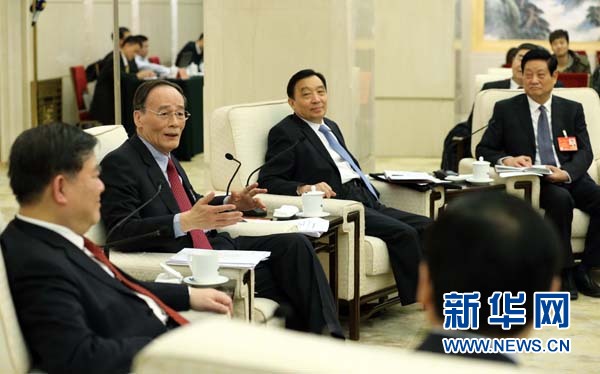 ??? 新華網(wǎng)北京3月9日電 中共中央政治局常委、中央紀(jì)委書記王岐山9日下午在十二屆全國人大二次會(huì)議陜西代表團(tuán)參加審議。