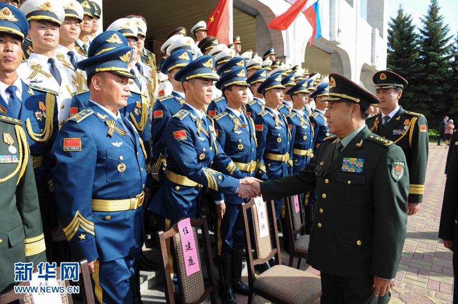??? 5月9日,在俄羅斯首都莫斯科,中共中央政治局委員、中央軍委副主席范長龍看望中國人民解放軍三軍儀仗隊官兵。受習(xí)近平主席委托,中共中央政治局委員、中央軍委副主席范長龍9日下午來到參加俄羅斯紀(jì)念衛(wèi)國戰(zhàn)爭勝利70周年慶典的我軍閱兵方隊駐地看望官兵,代表習(xí)主席和中央軍委向方隊官兵圓滿完成參閱任務(wù)表示祝賀,勉勵他們認(rèn)真總結(jié)經(jīng)驗,牢記強軍目標(biāo),獻(xiàn)身強軍實踐,為黨和人民再立新功。新華社記者戴天放攝??