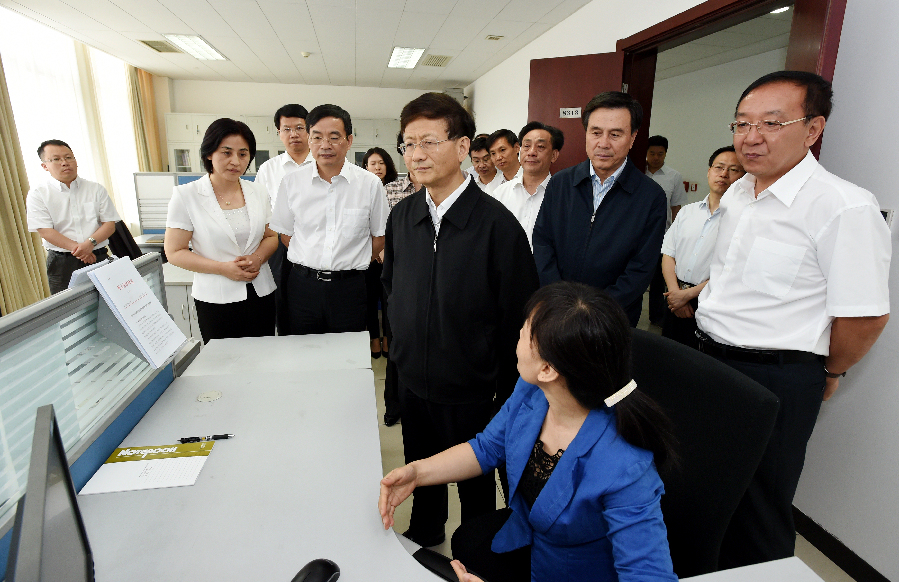5月27日,中共中央政治局委員、中央政法委書記孟建柱在國家信訪局調(diào)研。圖為孟建柱查看國家信訪信息系統(tǒng)運行情況。