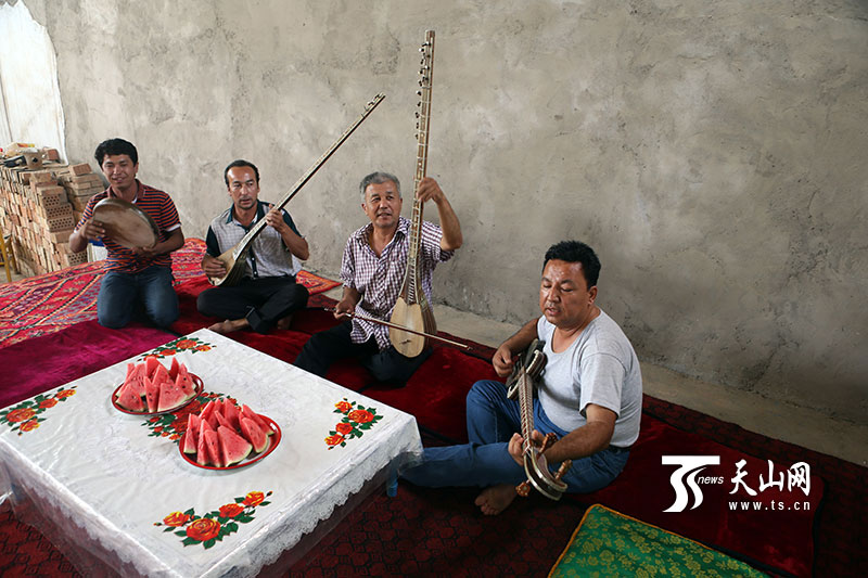 7月10日,蘇來(lái)曼·阿不都(右二)與村里的民間藝人一起奏唱《十二木卡姆》。新疆經(jīng)濟(jì)報(bào)記者 李瑞 攝