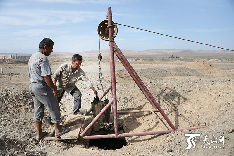一根繩、一個(gè)桶、一輛拖拉機(jī)頭,就是庫(kù)爾班·司馬義所有的作業(yè)工具。下井時(shí),人坐在一個(gè)T形的鐵管上,用繩索固定好,一頭連著的拖拉機(jī)緩緩開(kāi)動(dòng),將繩索這頭的人吊入豎井中。大約七八分鐘后,拖拉機(jī)后退,一小桶泥沙從井里升上來(lái),庫(kù)爾班和伙計(jì)們小心地站在井口,伸手取下桶來(lái),將泥沙倒掉又掛在繩索上,如此重復(fù)。