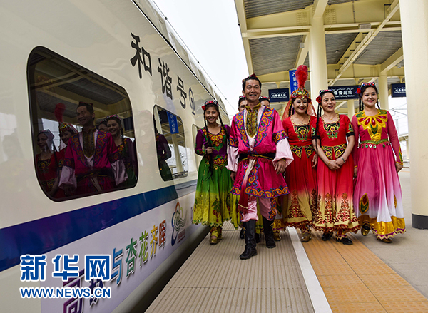 身穿民族服飾的當(dāng)?shù)鼐用裨谕卖敺闭居邮着俗案哞F杏花專列”抵達(dá)前來旅游的游客(2015年3月21日攝)。 新華社記者 趙戈 攝