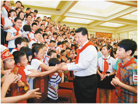 2015年6月1日,黨和國(guó)家領(lǐng)導(dǎo)人習(xí)近平、劉云山等在北京人民大會(huì)堂親切會(huì)見(jiàn)中國(guó)少年先鋒隊(duì)第七次全國(guó)代表大會(huì)全體代表。新華社記者 鞠鵬攝