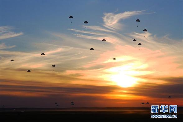 黃繼光生前所在連官兵在朱日和訓(xùn)練基地參加“礪劍-2013”集群傘降訓(xùn)練(2013年8月26日攝)。新華社發(fā)(袁文濤 攝)