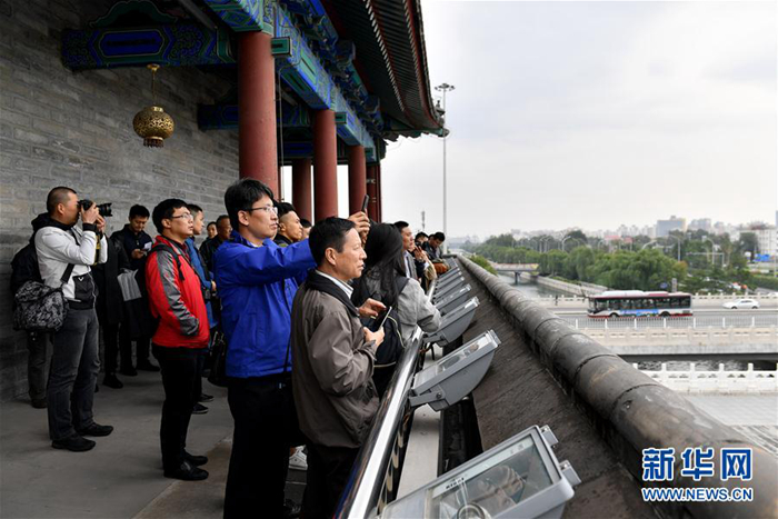 10月12日,記者團(tuán)在北京永定門(mén)城樓上參觀。新華社記者 李鑫 攝