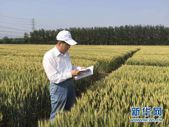 何中虎在中國農(nóng)業(yè)科學(xué)院昌平育種實驗站觀察小麥新品種(資料照片)。新華社發(fā)