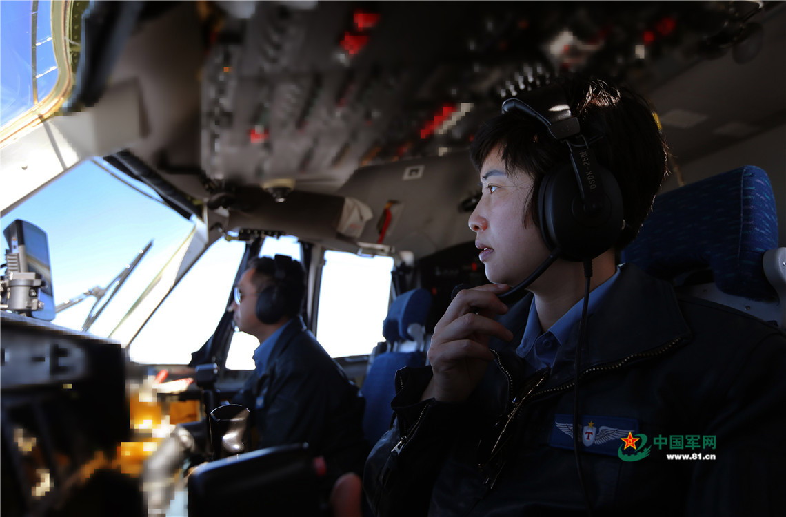 空軍首位運(yùn)-9飛機(jī)女機(jī)長(zhǎng)陳金蘭駕駛飛機(jī)飛赴目標(biāo)空域。劉暢 攝影