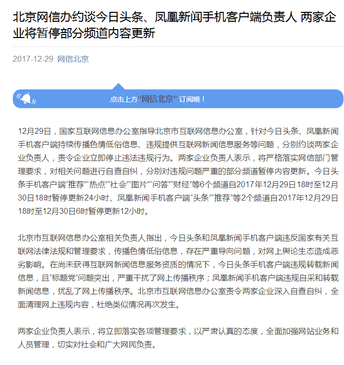 北京網(wǎng)信辦約談今日頭條、鳳凰新聞手機(jī)客戶端負(fù)責(zé)人