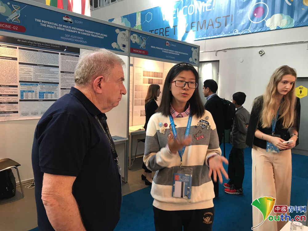 歐盟青少年科學(xué)家競(jìng)賽中,賀婉卓正在向外國專家做講解。本人供圖