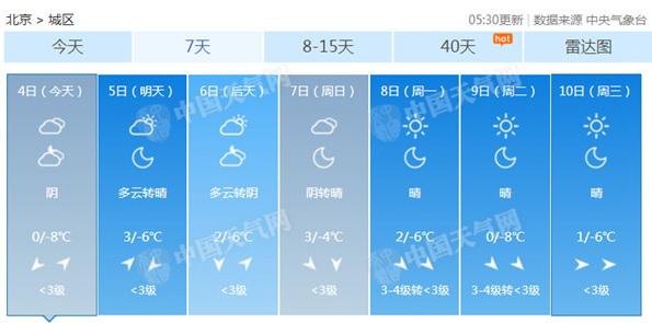 今天氣溫將處于冰點(diǎn)以下,明起稍有回升。北京市氣象臺(tái)預(yù)計(jì),今晨上班時(shí)多云,北轉(zhuǎn)南風(fēng)二三間四級(jí),-5~-3℃;白天多云轉(zhuǎn)陰,北轉(zhuǎn)南風(fēng)二三間四級(jí),最高氣溫僅0℃,為本周最低點(diǎn);夜間陰轉(zhuǎn)多云,西部山區(qū)有零星小雪,南轉(zhuǎn)北風(fēng)一二級(jí),最低氣溫-8℃,晝夜溫差達(dá)到8℃。明天開(kāi)始至周日最高氣溫將回升到2~3℃,但到下周初又將再次回落至冰點(diǎn)。