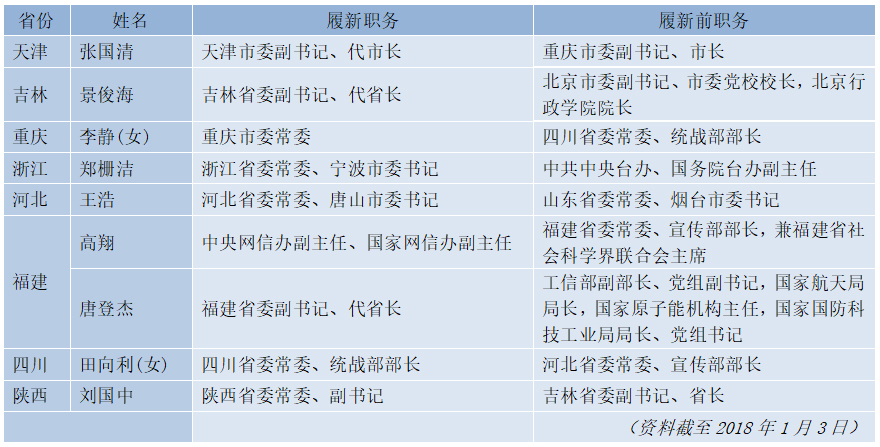 2017年12月,山東省委常委、煙臺市委書記王浩調任河北省委常委、唐山市委書記,河北省委常委、宣傳部部長田向利接替李靜出任四川省委常委、統(tǒng)戰(zhàn)部部長,李靜轉任重慶市委委員、常委。此番履新前,王浩一直在山東任職,田向利一直在河北任職,李靜一直在四川任職。
