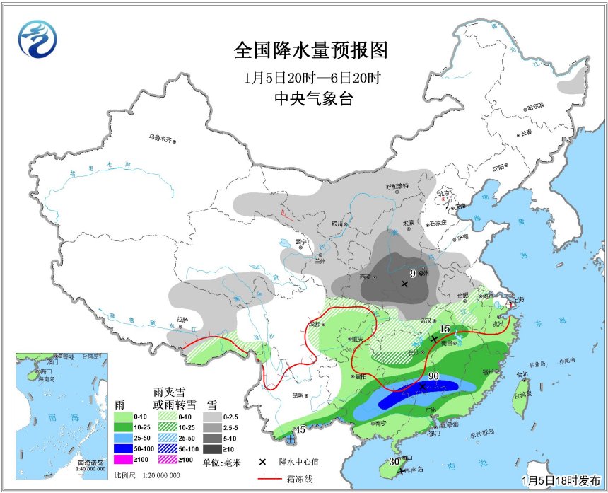 6日白天至8日,江南東部和南部、華南大部有中到大雨,其中湖南東南部、江西南部、福建西部和南部、廣東北部、廣西北部等地的部分地區(qū)有暴雨、局地大暴雨(累計(jì)雨量80~150毫米)。貴州中北部和湖南西北部局地有凍雨。