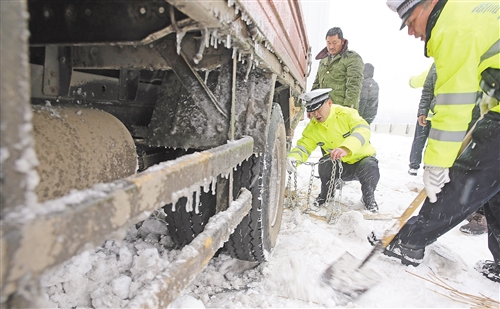1月4日,湖北襄陽民警在臥龍大橋上幫助車主安裝防滑鏈。1月3日夜里至4日,湖北襄陽、十堰普降大雪。襄陽各職能部門預先謀劃,全力應對雨雪天氣給道路通行安全帶來的不利影響。王虎 攝