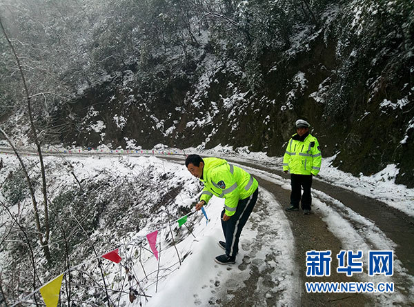 在湖北長陽土家族自治縣磨市鎮(zhèn)烏缽池村級(jí)公路,“路長”魏遠(yuǎn)義(右)和張昌軍(左)在積雪塌方路段拉警示繩(1月7日攝)。新華社記者 王自宸 攝