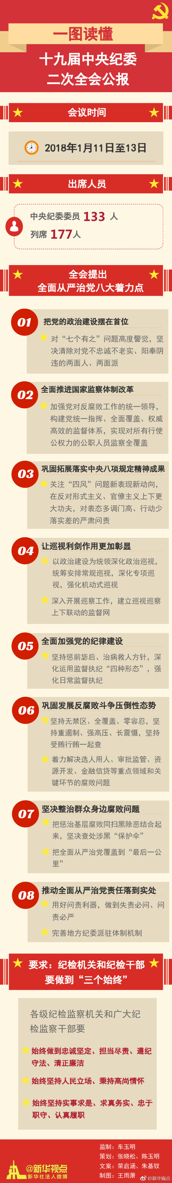 新華網(wǎng)北京1月13日電 13日審議通過的十九屆中央紀(jì)委二次全會公報新鮮出爐。想知道全面從嚴(yán)治黨如何發(fā)力?有這張圖在手,重點、亮點、焦點你都擁有!(據(jù)“新華視點”微博報道)