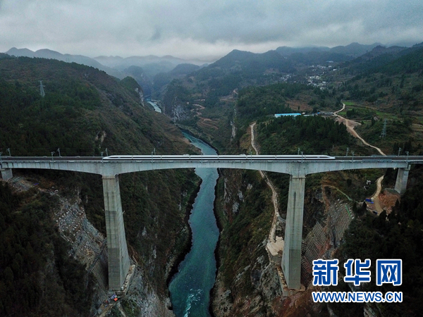 1月25日,渝貴鐵路從貴陽北到重慶西的D8592次首發(fā)動車經(jīng)過遵義市境內(nèi)的烏江大橋。 當(dāng)日,設(shè)計時速200公里的渝貴鐵路全線開通運(yùn)營。新華社記者 劉續(xù)攝