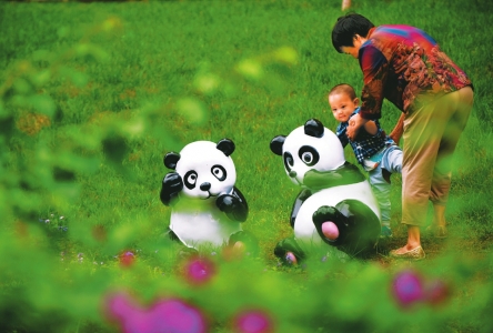 2月3日,冬日的陽(yáng)光明艷無(wú)比,成都三環(huán)路嬌子立交至航天立交外側(cè),濃密的樹叢里,一條灰磚小道在草地里蜿蜒。周圍散落的是各種熊貓的雕塑,有彩色的,也有用植物打造的。